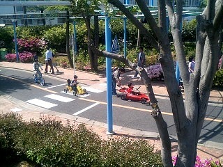 ここは車が入れない公園で、子供達が交通ルールを覚えながら信号で停まったりして楽しそうに走ってます。