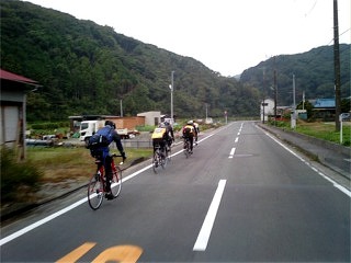 松崎からはしばらく平坦だったのですが、向かい風が強いのでトレインを組もうと誰かが言い出して、ばっちゃんさん、ほいさん、Takさんが引き始めます。