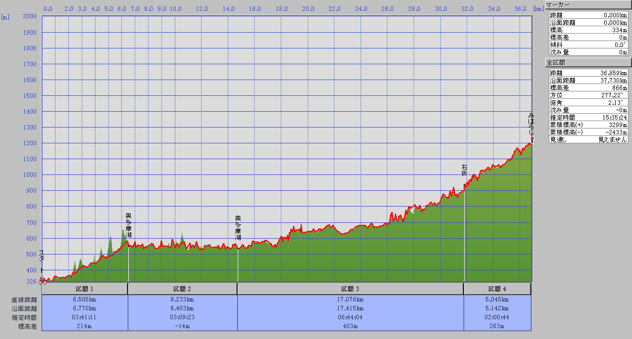 そして肝心な勾配は、スタートしてからガッと登り、奥多摩湖沿いで軽く一息。