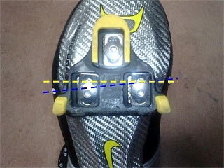 いろいろ読んでみると、僕が知らなかっただけなのだが、クリートにはペダル軸の位置がわかるように印がつけてあるらしい。