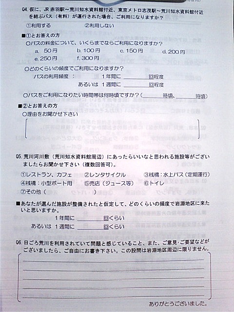 岩淵を訪れる回数や、この辺にあったらいいと思う施設、そして要望等を記入して提出すると冷たいペットボトルの水をもらえた。