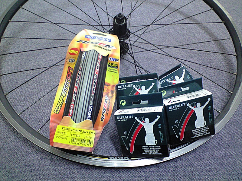 まずは昨日パンクしてしまい、タイヤも亀裂が一杯だったので、電話でお願いしておいたHUTCHINSONのタイヤと、バーゲンで安くなっていたチューブを購入。
