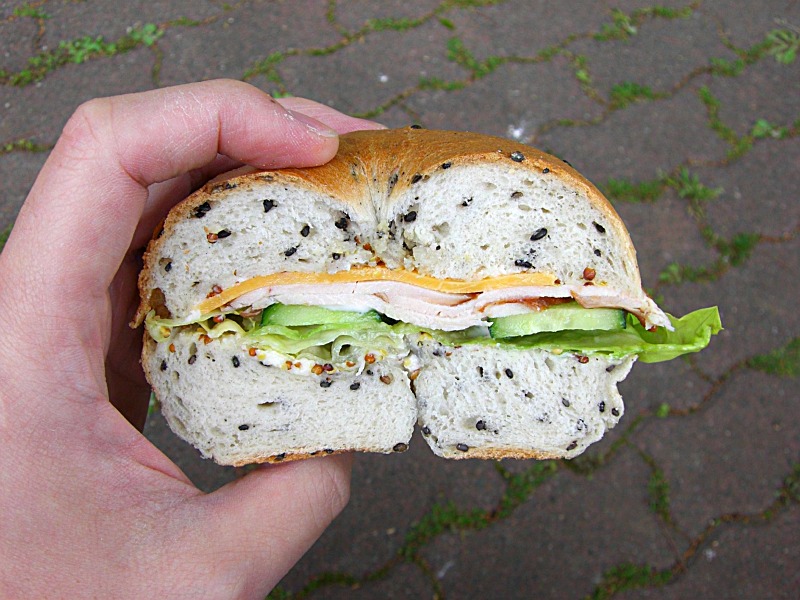 今日買ったのは、ちょっとした勘違いでセサミベーグルにチキンとチェダーチーズの組み合わせ。