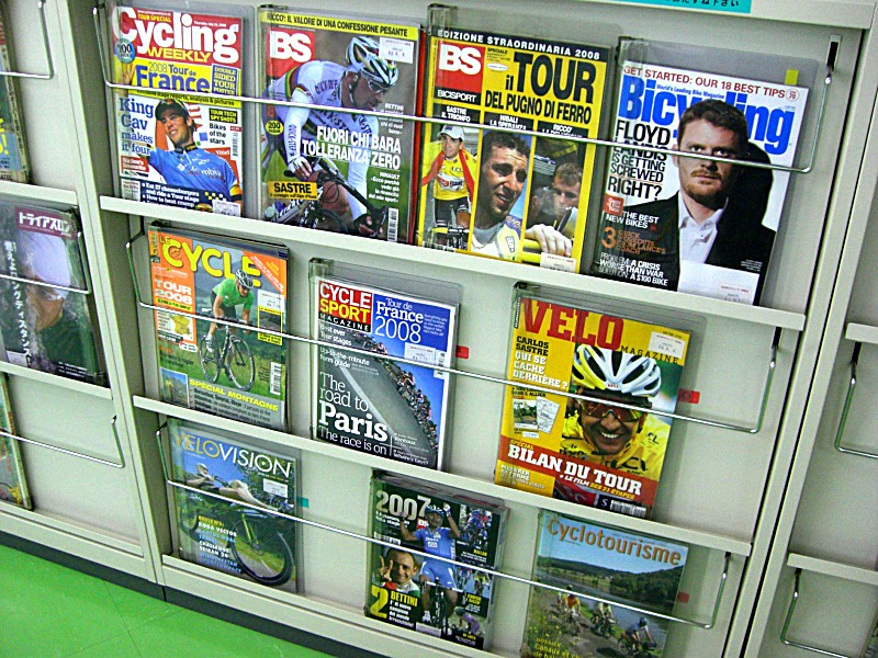 事務所内にはTT用ヘルメットが飾られていたり各種自転車雑誌の他、海外の雑誌も置いてあったりして本格的です。