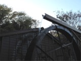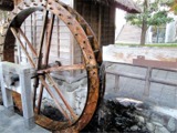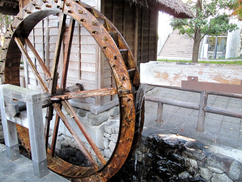 大きな水車のモニュメントを過ぎると、大小の水車が動いており、大きな音を立てて建物内のこんにゃく挽きや精米の機械を回しています。