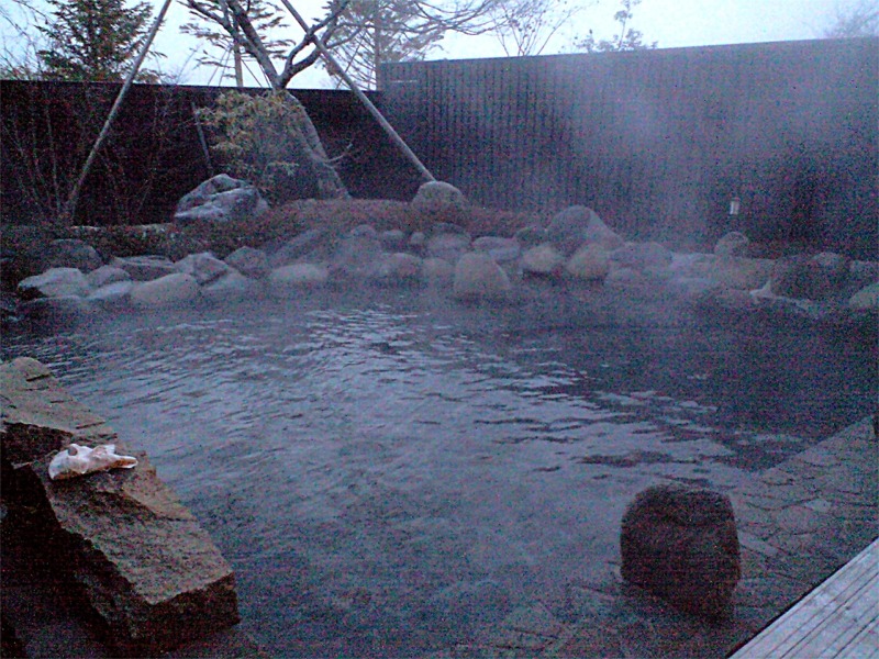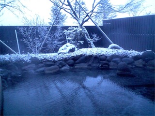 新年早々雪がちらつく中、早朝の露天風呂で去年の疲れをしっかり癒してモチベーションを高めることに!