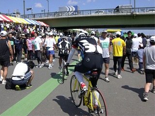 写真のように、ランナー達がコース全体に広がっていて自転車の走る隙間もありません。