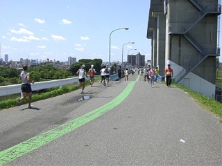 帰りの岩淵水門では、マラソンの給水ポイントがあるおかげでもの凄いランナーの数。