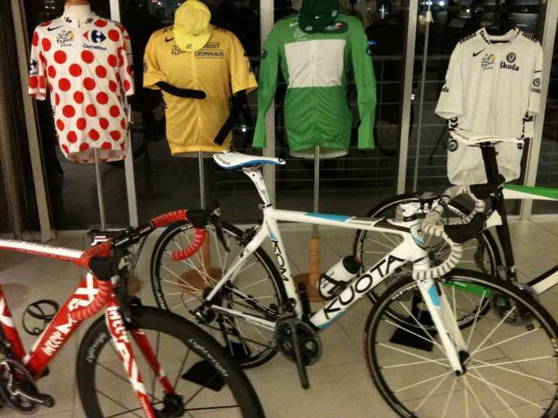 会場に到着すると、早速ツール・ド・フランスコーナーが設置されていて、今日の解説を行う今中大介さんが代表を務めるINTERMAXの自転車と各賞のジャージが展示されていました。