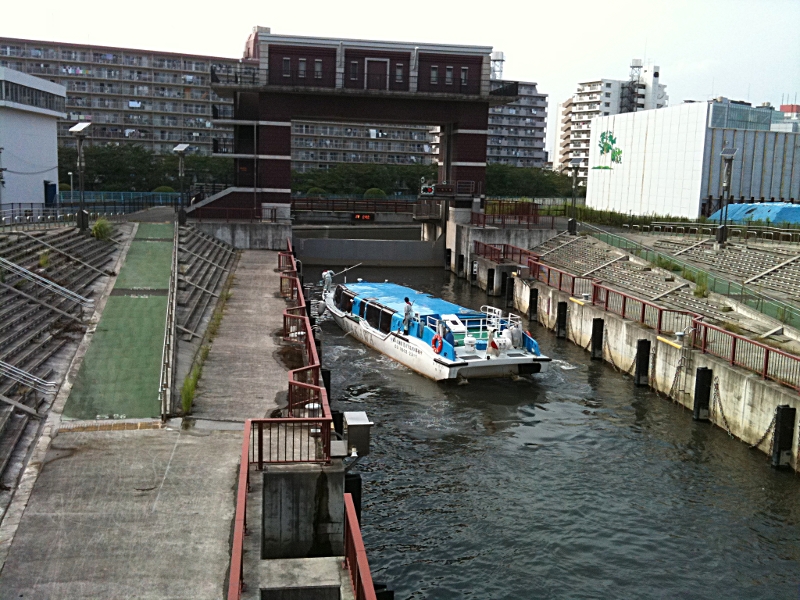 荒川ロックゲートに通りかかると、ちょうど船の通行中でした。
