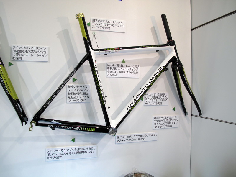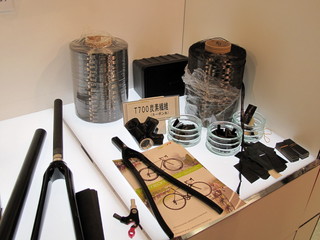 フレームに使用されるカーボンの他に様々なカーボン繊維が比較展示されていて、高剛性のものや高弾性のもの、厚みによる違いなどがあって興味深かった。