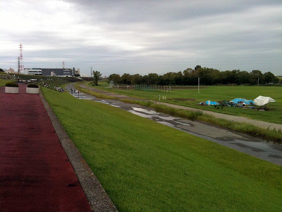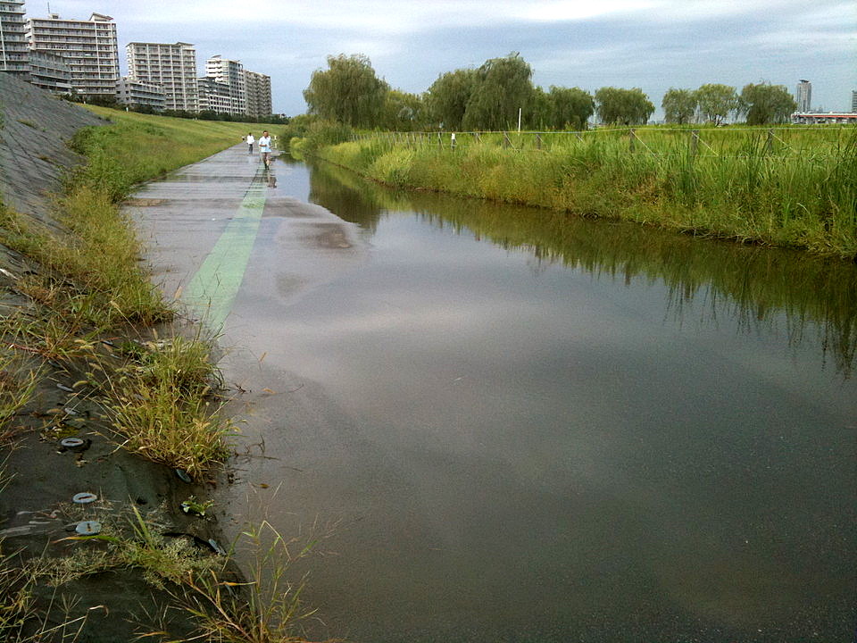 戸田橋から陸上競技場は予想通り水溜りが多かったので、土手上に避難します。