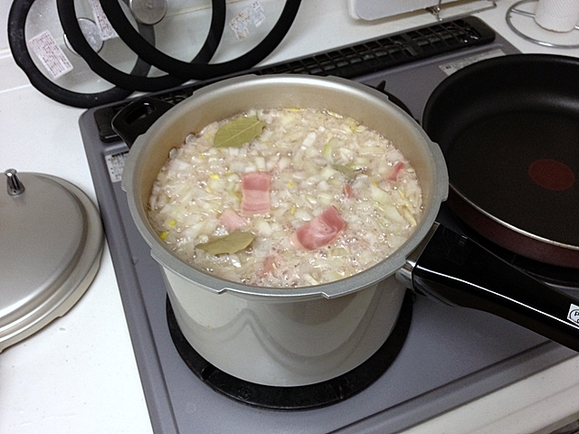 水に浸しておいた豆を圧力鍋に入れ、みじん切りにした玉ねぎ、細かく切ったベーコン、そしてローレルを入れて煮込んでいきます。