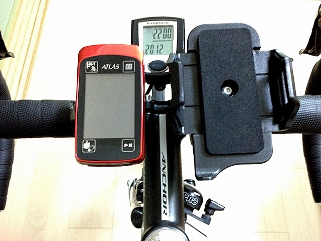今までハンドル周りは有線式サイコンのemetersとライトもしくはiPhoneを取り付けていましたが、ステムにはYUPITERUのGPS"ASG-CM31"を追加したところ、iPhoneとGPSが干渉してしまい、どちらかしか取り付けられない状態になっています。