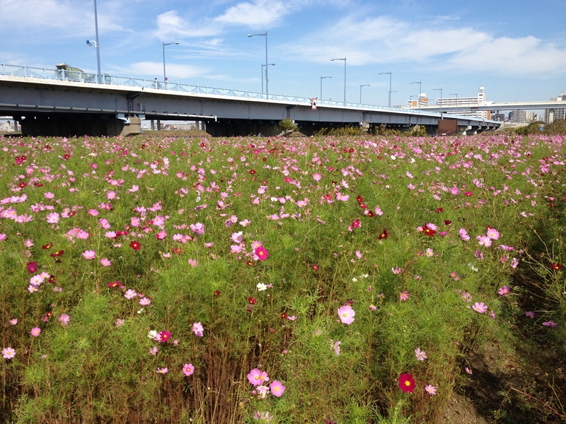 平井大橋付近にあるコスモス畑では、何本ものコスモスが風に揺られていました。