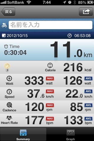 走り終わると、ワット、スピード、ケイデンス、心拍の最高値と平均値が確認できます。