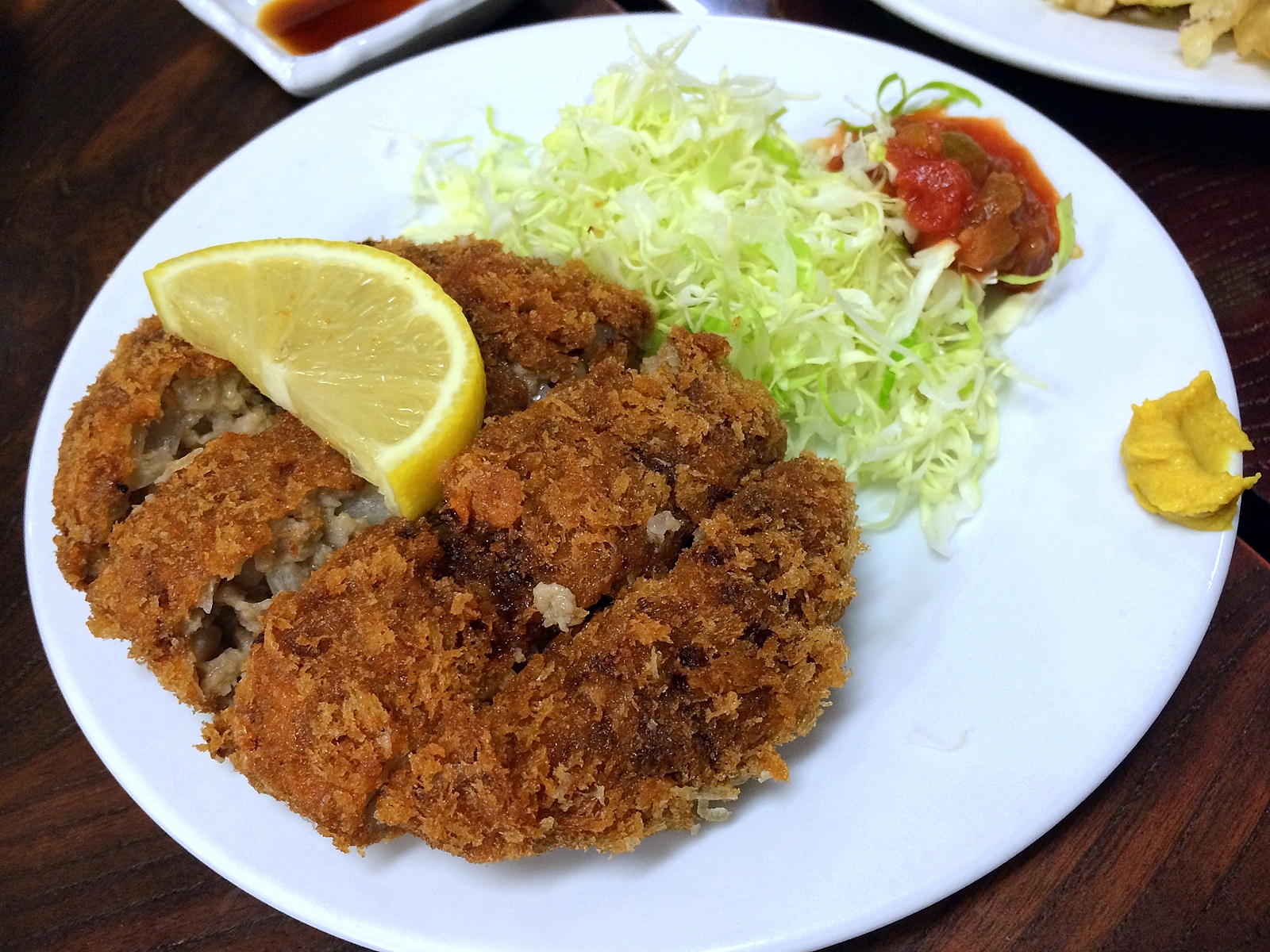 特大の自家製ジャンボメンチカツと、うなぎの骨を炙ったカルシュウム。