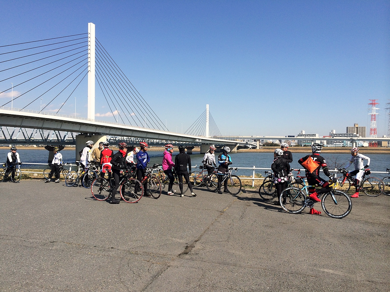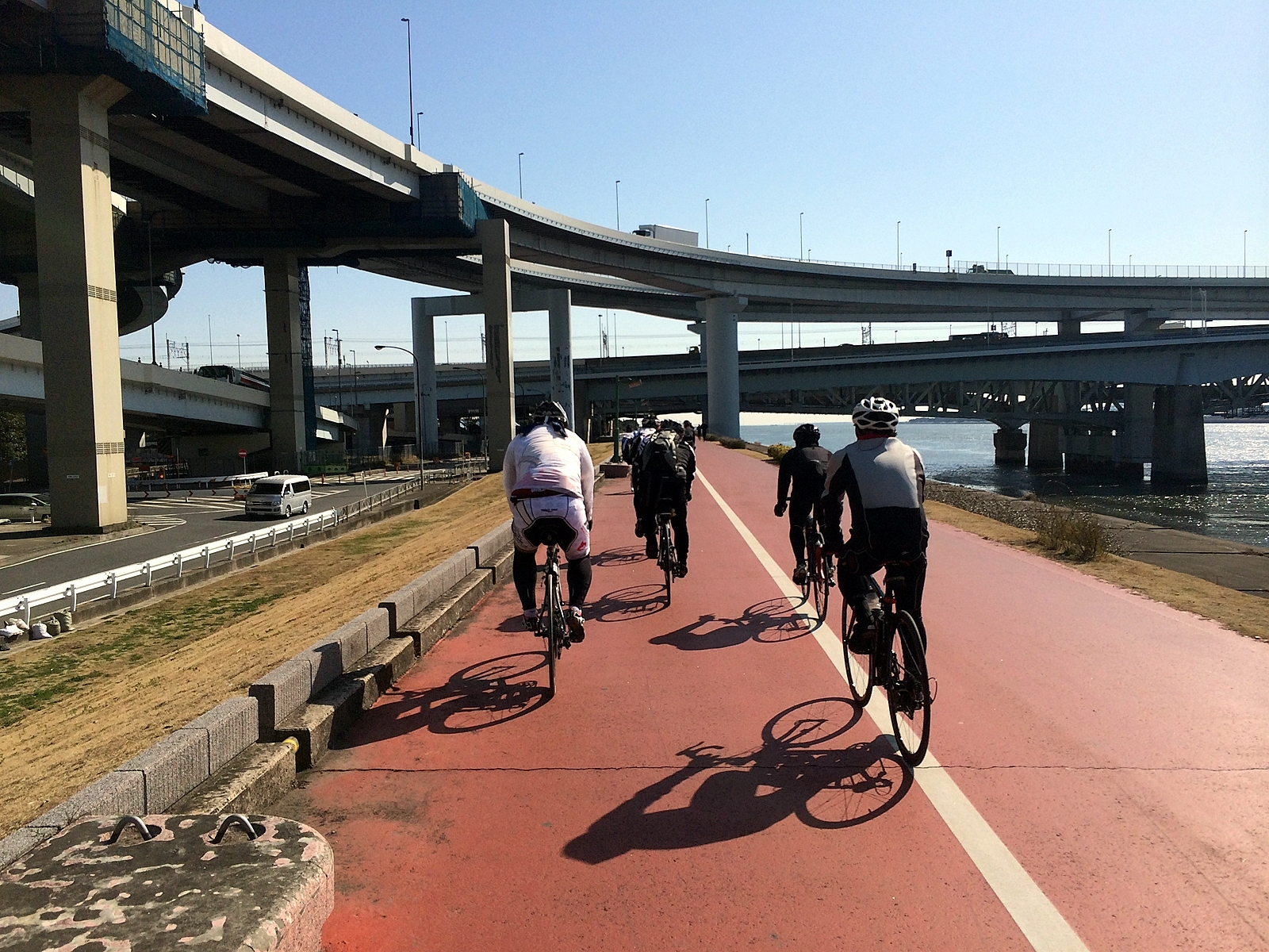 四ツ木橋で右岸に渡り、清砂大橋で遅れたメンバーを待ち、清砂大橋を渡った後は健康ロードを使って葛西臨海公園に向かいます。